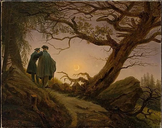 Estaba anocheciendo y una luna creciente iluminaba el lugar entre el hueco de dos árboles que estaban medio vivos y medio muertos. En ese mismo hueco, se recortaba la figura de dos hombres que miraban absortos la luna que parecía el último suspiro de un vagabundo. Eran hombres vestidos de gris, como el cielo en el que la luna flotaba. Uno de ellos apoyaba su cuerpo en un bastón, mientras el otro se apoyaba en el hombro de su compañero. Parecía que estaban de duelo, no hablaban, sólo miraban a la luna como si esta estuviese moribunda. No se dieron cuenta de que yo les observaba, procuré no hacer ruido para no interrumpir aquel silencio gris que lo llenaba todo.